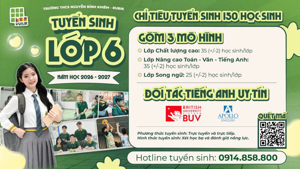 Trường THCS Nguyễn Bỉnh Khiêm – Rubik chính thức thông báo tuyển sinh lớp 6 năm học 2026-2027 với 150 chỉ tiêu, gồm 03 mô hình đào tạo: – Lớp Chất lượng cao: 35 (+/-2) học sinh/lớp – Học phí: 8.000.000 VNĐ/tháng – Lớp Nâng cao Toán – Văn – Tiếng Anh: 35 (+/-2) học […]